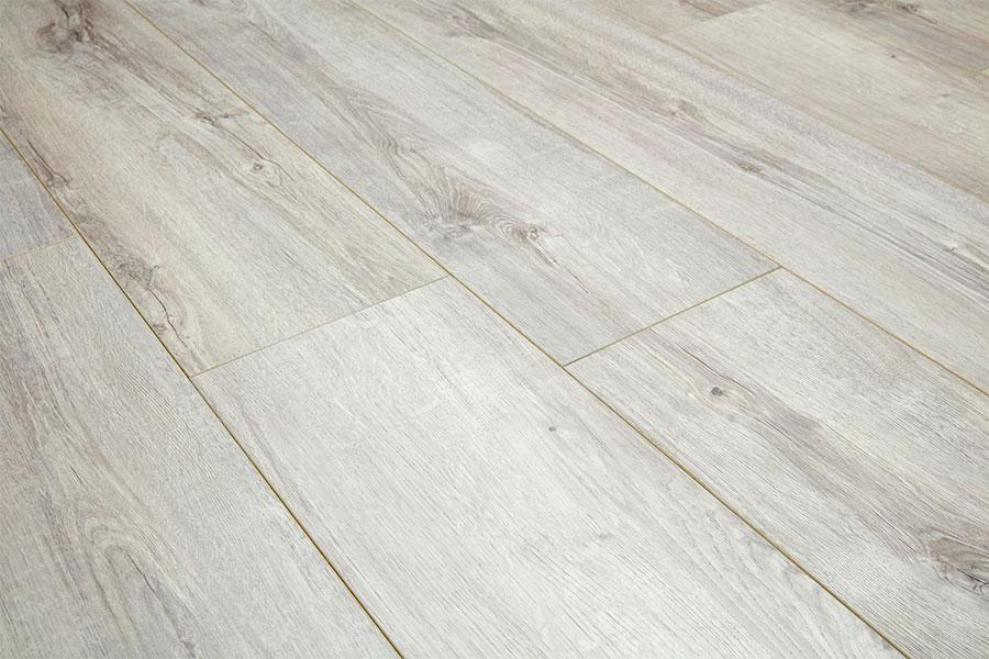 Audacity 12mm Laminate Flooring in the Cove Oak finish features light grey tones with a textured surface and bevelled edges to create an authentic wood appearance.