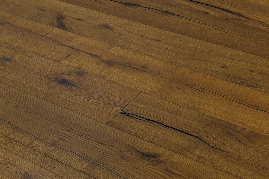 Galleria Professional Distressed Extra Rustic Engineered Oak Flooring in the Gingerbread Lacquered finish offers a deep brown tone with pronounced rustic features.