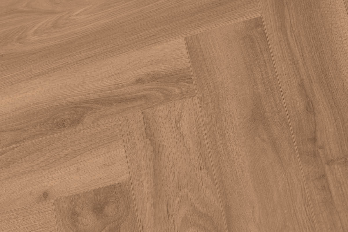 Series Woods 8mm Herringbone Laminate Flooring in Warm Honey Oak features warm golden tones and a natural grain pattern for a realistic wood-effect appearance.